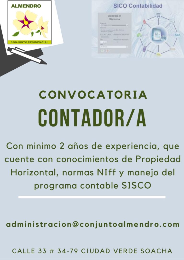 Convocatoria: Contador/a. Con mínimo 2 años de experiencia, conocimientos en propiedad horizontal, normas NIff y manejo del programa contable SISCO…